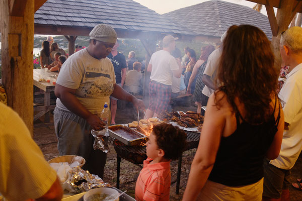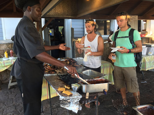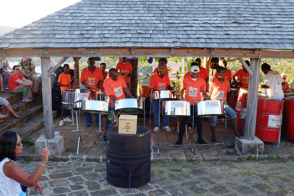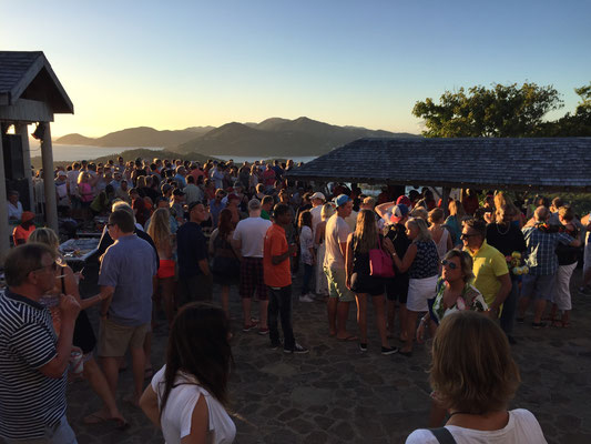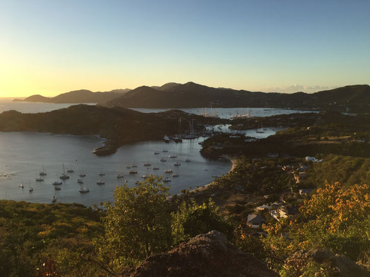 Sonntagabend versammelt man sich zur wöchentlichen Party auf Shirley Heights. Dies ist ein Hügel gegenüber des English Harbours mit einem Restaurant und einer großartigen Aussicht. Es gibt BBQ und Rumpunsch und eine Band spielt Steel und Reggae. Wir sind zuerst wetterbedingt nicht sehr motiviert, noch "wandern" zu gehen, können uns aber schlussendlich doch aufraffen. Im English Harbour erwischen wir das letzte Wassertaxi über die Bucht und ein nettes britisches Paar zeigt uns den Pfad.
