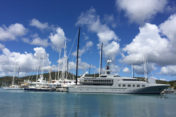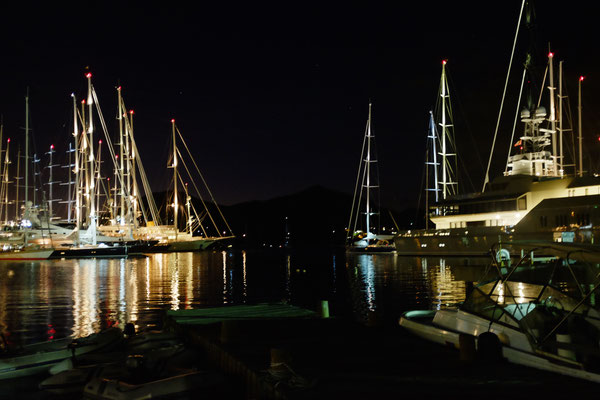 Das Besondere an diesem Ankerplatz ist sicherlich die schiere Menge an Super- und Megayachten (Segler und Motorkähne), die in den beiden Marinas festgemacht sind. Nachts ist eine schöner als die andere beleuchtet. Wenn man zum Dinghysteg fährt, geht es in der Mitte hindurch und man weiß nicht recht, wohin man zuerst gucken soll. Erstaunlicherweise gibt es allerdings auch in dieser Größenklasse noch deutliche Geschmacksverirrungen.
