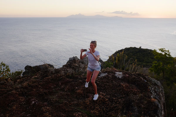 Man läuft 20 Minuten durch schöne Trockenvegetation bergauf, der Großteil des Wegs liegt aber immerhin im Schatten. Oben angekommen gibt es eine große Wiese, auf der uns schon die Crews der Step by Step 2 und Croix du Sud winken. Wir haben einen wahninnig schönen Ausblick zum Sonnenuntergang und verbringen einen sehr netten Abend in der Runde.