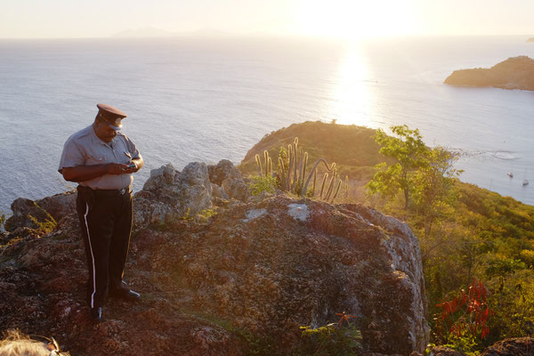 An der Klippe von Shirley Heights steht ein Polizist Wache, offenbar soll er verhindern, dass Gäste über die kleine Mauer steigen - hinter der Klippe ist ein tiefer Abgrund. Wie man sieht, funktioniert das nur bedingt.