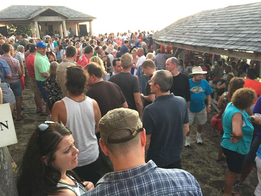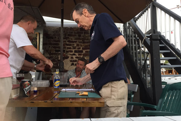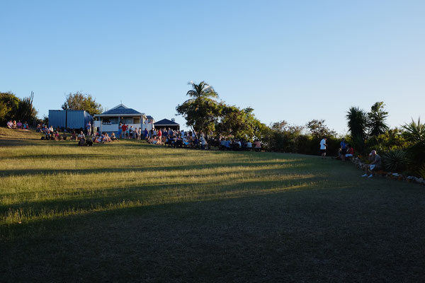Ein großer Kreis wird gebildet (immerhin ca. 20 - 30 Personen!). Wir denken spontan an Stonehenge und keltische Riten, aber es läuft darauf hinaus, dass ein Toast auf die Queen ausgebracht wird. Das ganze wird noch zweimal wiederholt, dann nimmt der Abend seinen üblichen Lauf. Wir haben den Inhaber der Bar gefragt, ob heute ein besonderer Tag wäre, aber dies war nicht der Fall. Dieses Happening findet jeden Abend zum Sonnenuntergang statt! Chapeau, wie der Franzose sagen würde....