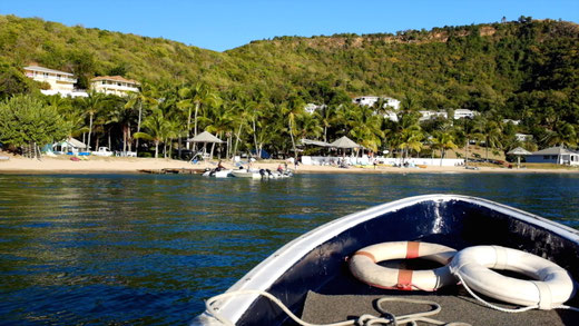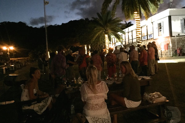 Zum Sonnenuntergang werden wir Zeugen eines für uns ungewohnten Schauspiels: gemeinsam mit uns bevölkert ein munteres Grüppchen britischer Segler im gestandenen Seemannsalter die Bar. Draußen auf einem Tisch werden mitgebrachte Plastikbecher aufgereiht und mit Rum gefüllt. Jeder nimmt sich einen Becher und alle versammeln sich auf dem Rasenstück nebenan.