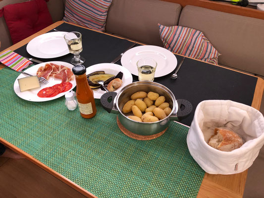 Wir schnappen uns den auf der Bootsmesse erstandenen Törnführer und suchen uns die erstbeste Ankermöglichkeit Richtung Nordosten aus. Nur um festzustellen, dass wir seeehr lange nicht mehr bei so wenig Wind geankert haben. Da die Bucht sehr offen ist, liegen wir quer zum Schwell und spielen das beliebte Spiel „was klappert denn jetzt wieder?“. Na gut - Ausschlafen gehört nicht zwingend zum Segelurlaub dazu.